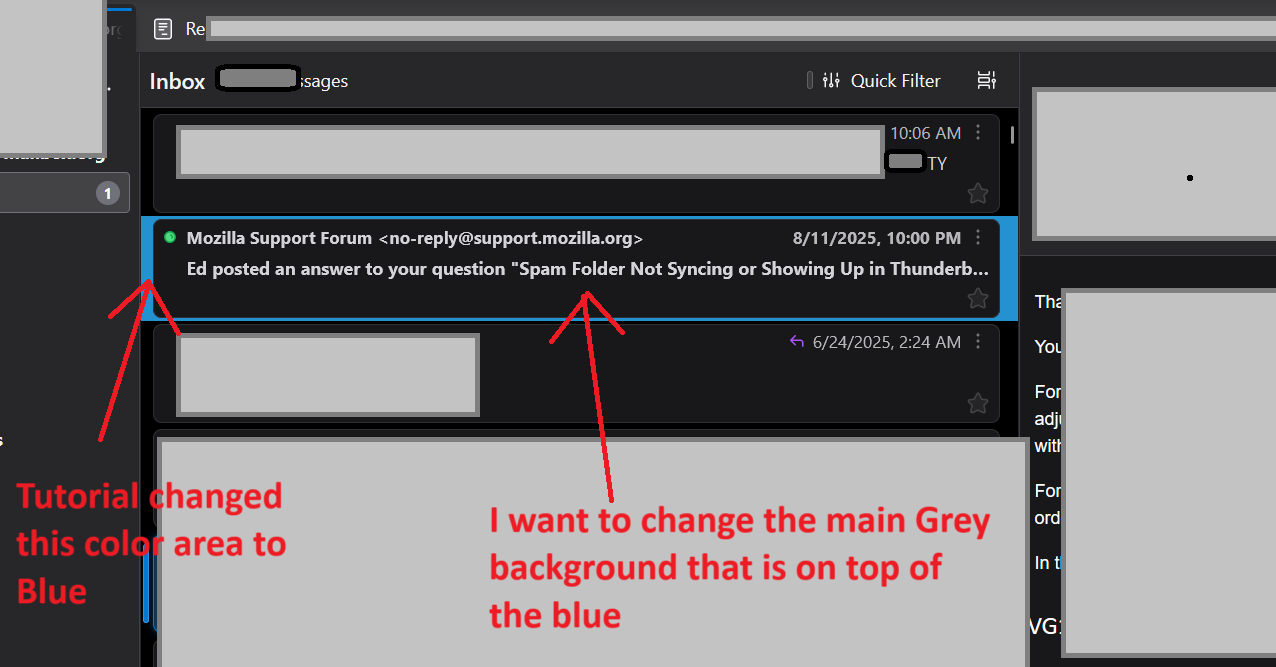 I found multiple tutorials to change the font color, and the back-background color, but not the actual primary background area in my screenshot. https://support.mozilla.org/en-US/questions/1441429#question-reply ''' This one changes the Font color:''' color: #2492d1 !important; '''This changed the far back background color, not primary background:''' background-color: #2492d1 !important;