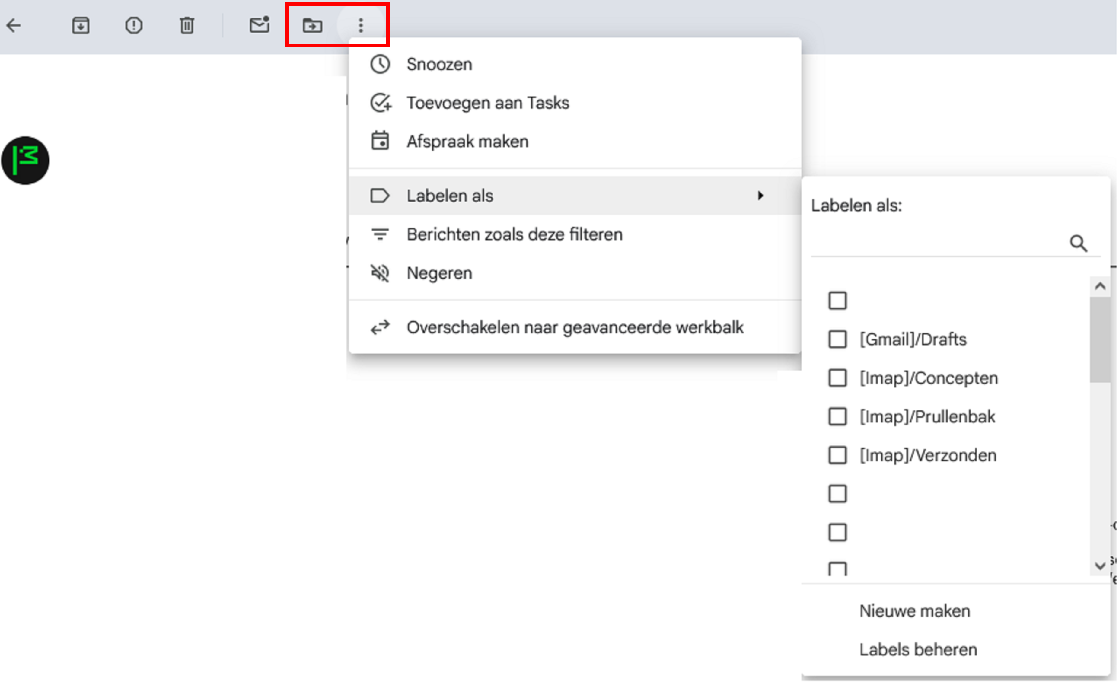 Deze pictogrammen zijn te zien na het openen van het bericht, of na het aanvinken van het selectievakje voor het bericht in het totaaloverzicht van de mailberichten.