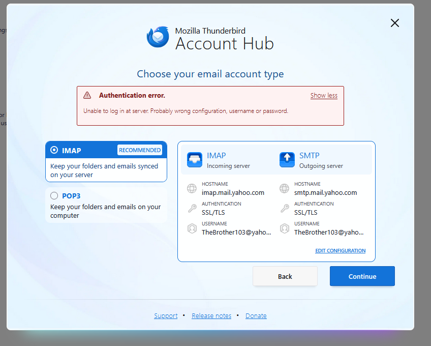I'm trying to connect my Yahoo Mail to Thunderbird, but after authentication with yahoo, i get this error right after in Thunderbird: