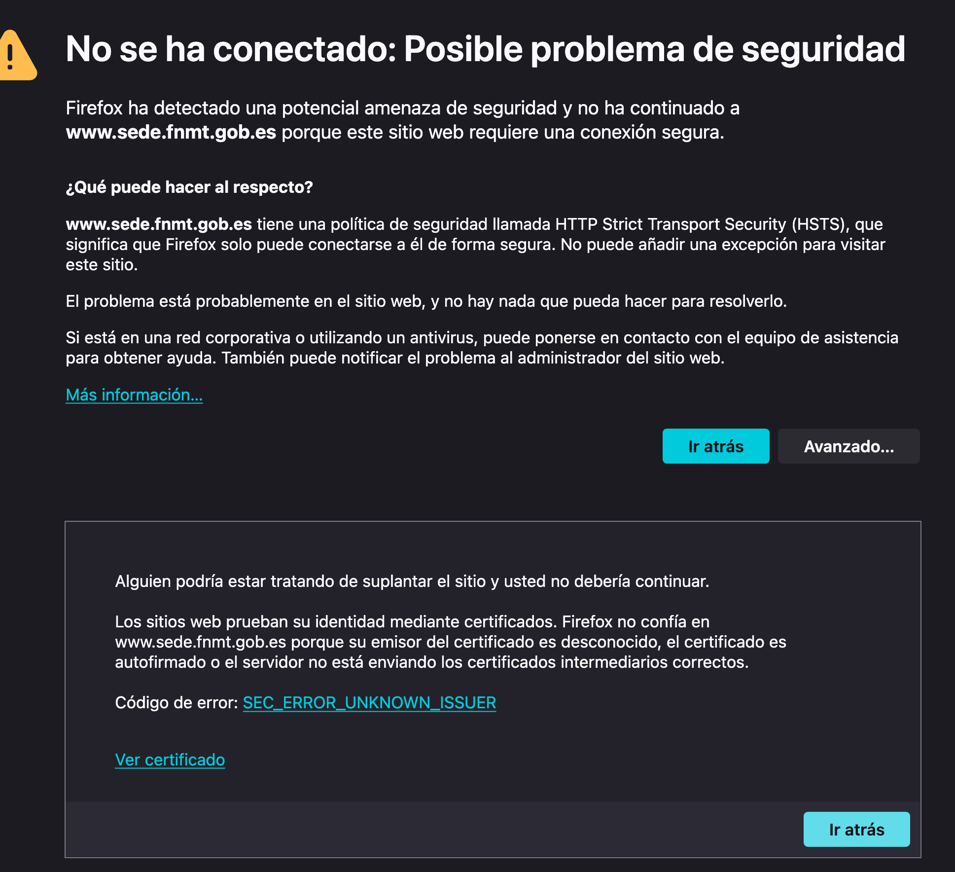 buenos dias, ayer instale en mi computador apple un certificado de raiz de la fabrica nacional de moneda y timbre de España, la instalación fue correcta, pero al intentar acceder a algunas paginas oficiales como la propia de la fabrica nacional, el navegador Firefox 144.0.2 me lo impide con un mensaje que dice : No se ha conectado: Posible problema de seguridad Firefox ha detectado una potencial amenaza de seguridad y no ha continuado a www.sede.fnmt.gob.es porque este sitio web requiere una conexión segura. Que puedo hacer al respecto???