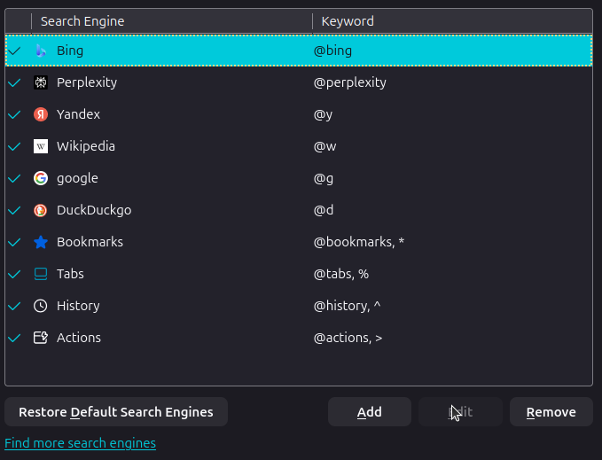 I wanted to set keywords for search engines (in order to quickly change them for a single query). This cannot be done for search engines by default (why?), so I had to delete them and create a new one with the same link and my own keywords. But now I can't give them the same name back, firefox says that such a search engine already exists. In general, it doesn't matter to me which letter is there. The main purpose of my appeal is to draw attention to the fact that search engines cannot be edited by default, because it is quite inconvenient. Thanks for the answer (I apologize in advance if I made a grammatical mistake somewhere, I used a translator) My OS: Ubuntu 24.04 LTS; firefox version: 145.0.2 (64-bit)