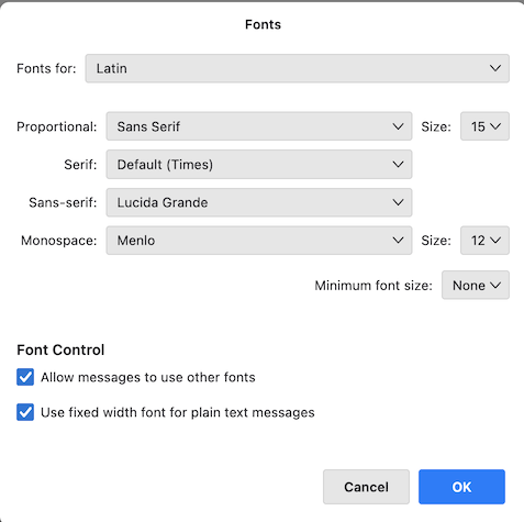 I just verified in a new Thunderbird profile. My new image shows the default (original) font settings in my macOS version of Thunderbird. You could give them a try...