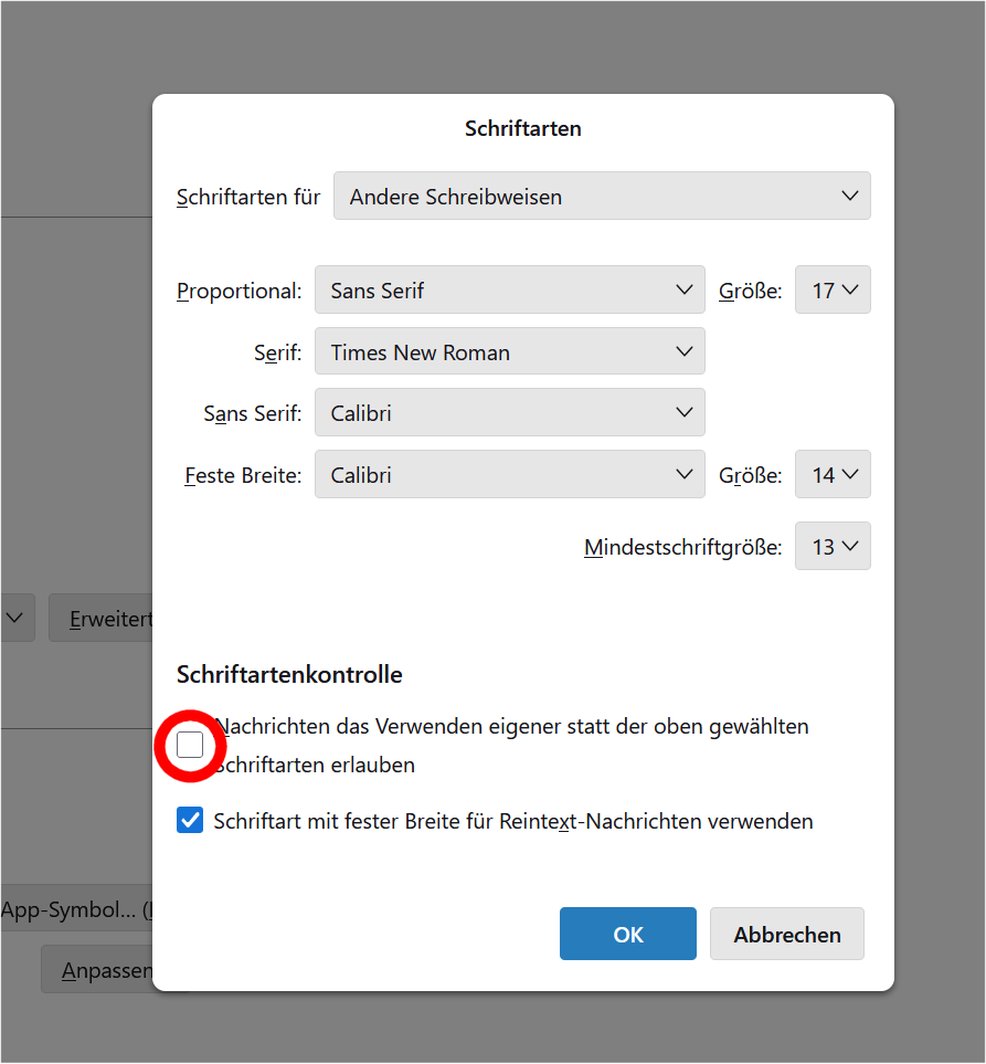 As you can see in the screenshot, the umlauts are missing in many emails. Unfortunately, the corresponding fonts can no longer be set in Thunderbird; I use version 140.6.0esr (32-bit). Where can I set that ä, ö, ü, ß (...) are displayed normally? Greetings from Berlin, Markus