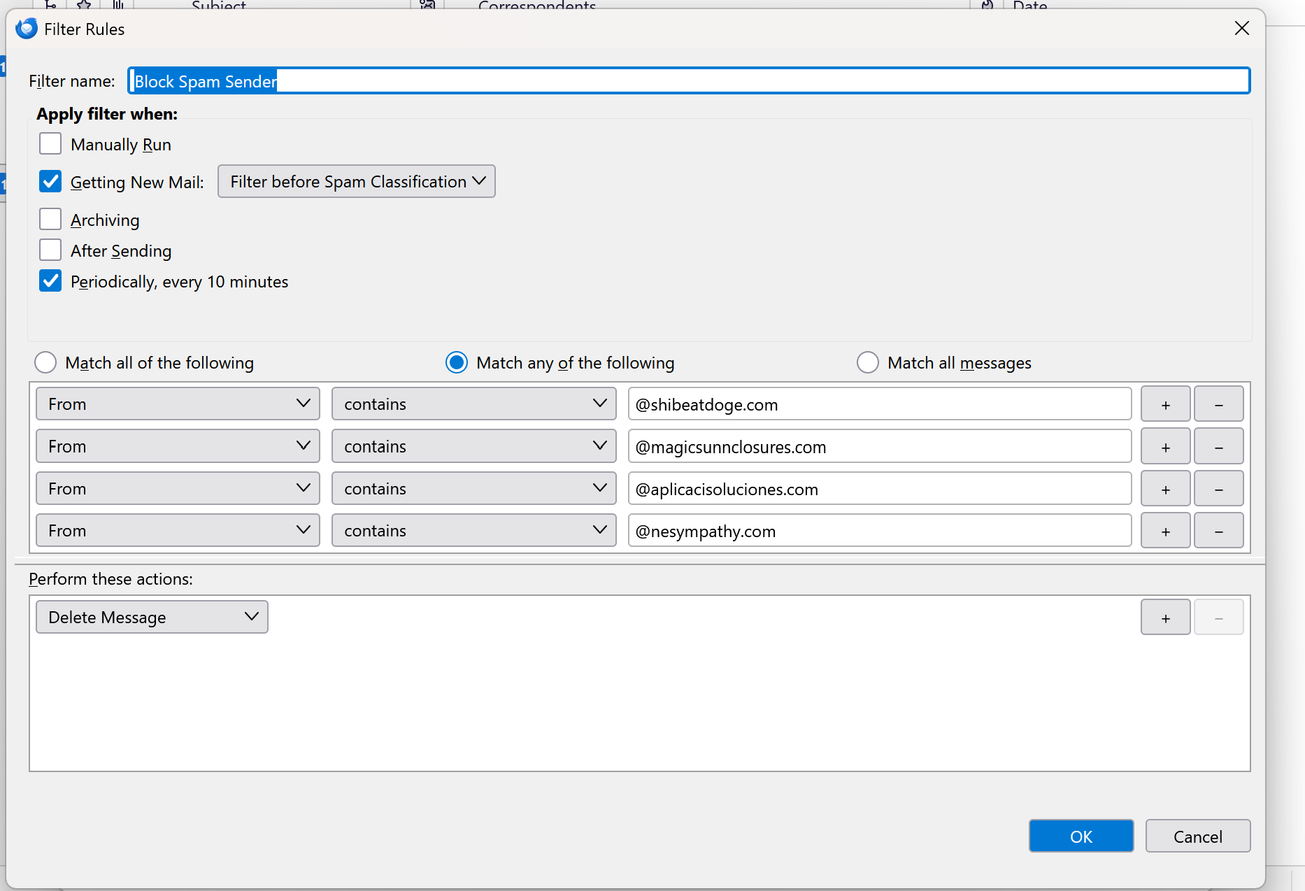 I started using Thunderbird in hopes it would remove emails from specific email addresses because I don't want to sort through junk emails. The filter I created is not automatically deleting them but If i run it manually it does. I've attachedd a screen shot showing my settings. Am I doing anything wrong? My understanding it that Thunderbird offers this functionality but please let me know if they do not.