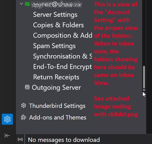 @David said: "I am thinking there is no problem, but a misunderstanding of the folder pane and the account settings pane." I disagree - there, IMO is something wrong if every account shows the Inbox, Drafts, Templates, Sent, Archives, Deleted, and Spam, folders under each Email accounts user ID (me@a-loss.xyz and the last email address at the bottom fails to show it.