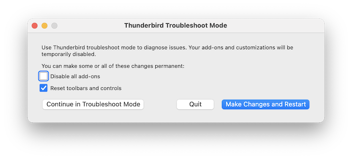 Troubleshoot mode (aka safe mode) temporarily affects the following (https://kb.mozillazine.org/Safe_Mode or https://support.mozilla.org/en-US/kb/troubleshoot-mode-thunderbird):