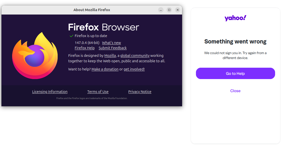 Recently I upgraded to Ubuntu 24.04.4 LTS from the earlier 22.04. I have Upon logging into yahoo Email on Firefox version- 147.0.4, the message - "Something went wrong We could not sign you in. Try again from a different device." is coming up. (Please refer to attached screen shot) All attempts with alternate method - with recovery methods were not success full (on Firefox)
