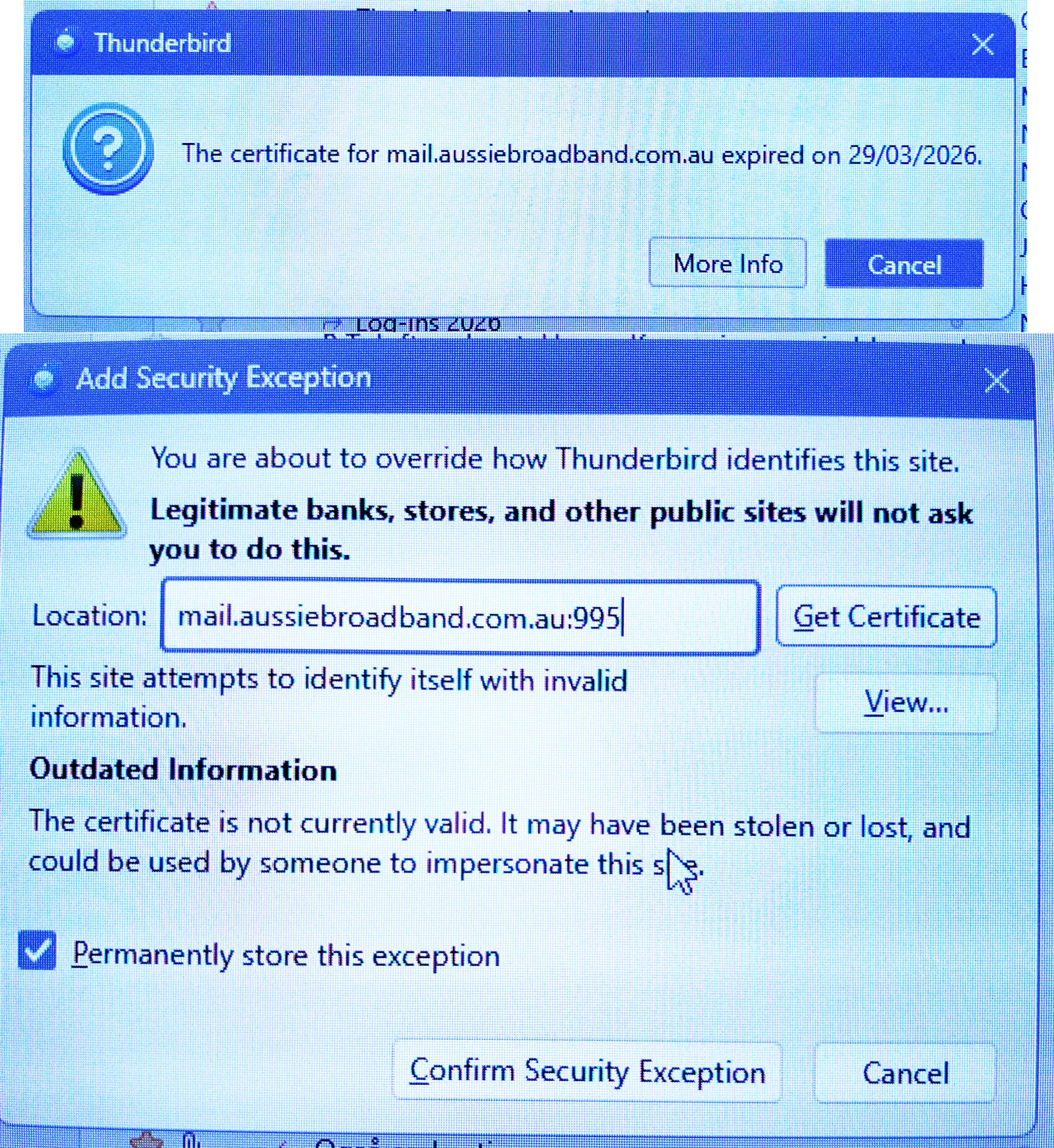 I can send emails but not receive because of this in my Thunderbird. I also have email setup on my mobile phone and can receive and send on that one and received your code number on my mobile phone.